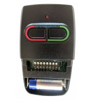 two button visor gate or garage door opener radio control transmitter that is compatible with the Allstar, Allister, Pulsar, GTO and Mighty Mule brand of radio controls with